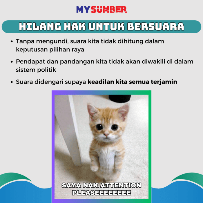 Namun, pilihan raya tidak ada maknanya kalau pengundi sendiri tak keluar untuk mengundi. Walaupun tiada hukuman yang akan dikenakan bagi warganegaranya yang tak turun undi pilihan raya, ia tetap menjadi keperluan yang penting dalam pemerintahan. Dengan mengundi kita telah menunaikan hak dan tanggungjawab sebagai warganegara kepada negara dan juga masa depan anak cucu kita. ‘Tak rugi apa pun kalau tak mengundi, mengundi pun bukan dapat apa,” kata mereka yang tak mengundi. Ada ke kerugian kalau kita tak pergi mengundi? Dalam artikel ini kita akan kupas apa kerugian yang kalau kita tak keluar mengundi pilihan raya.