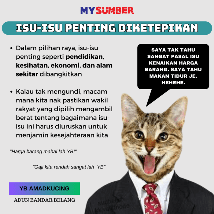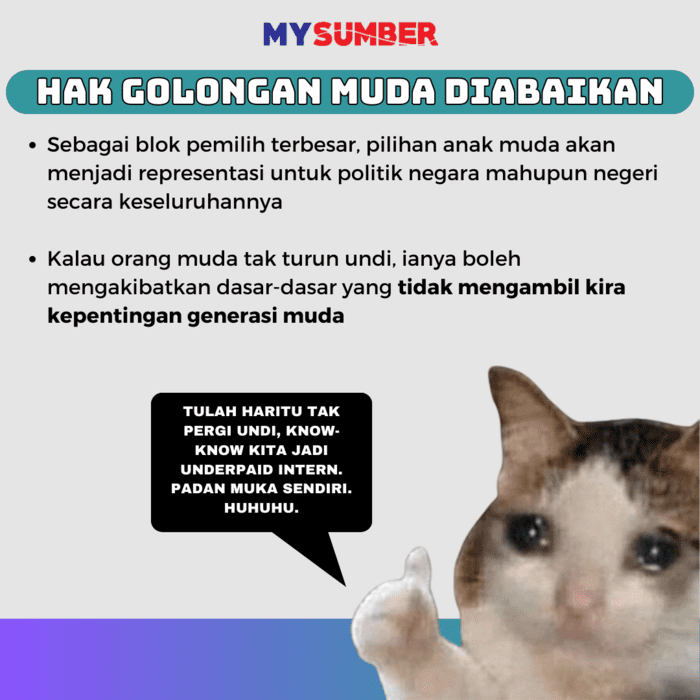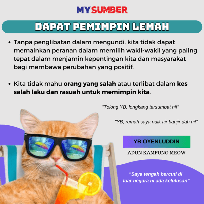 Dalam pilihan raya, isu-isu penting seperti pendidikan, kesihatan, ekonomi, dan alam sekitar akan dibangkitkan. Kalau kita tidak mengundi, macam mana kita nak pastikan wakil rakyat yang dipilih mengambil berat tentang bagaimana isu-isu ini harus diuruskan untuk menjamin kesejahteraan kita.