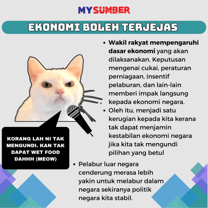 Wakil-wakil rakyat yang terpilih dalam pilihan raya mempengaruhi dasar-dasar ekonomi yang akan dilaksanakan. Keputusan mengenai cukai, peraturan perniagaan, insentif pelaburan, dan lain-lain boleh memberi impak langsung kepada ekonomi negara. Oleh itu, menjadi satu kerugian kepada kita kerana tak dapat menjamin kestabilan ekonomi negara jika tidak turun mengundi. Ini lah sebabnya kita perlu gunakan peluang ini dan laksanakan tanggungjawab kita sebagai rakyat Malaysia dalam pilihan raya.