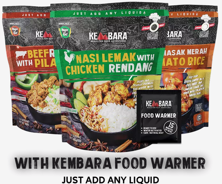 Pek makanan seperti Kembara Meal sesuai untuk korang bawa pergi berkhemah kerana mudah disediakan. Cukup korang tambah air dalam bekas yang mempunyai heat pack di dalamnya, biarkan selama beberapa minit dan makanan tersebut sedia untuk dimakan.