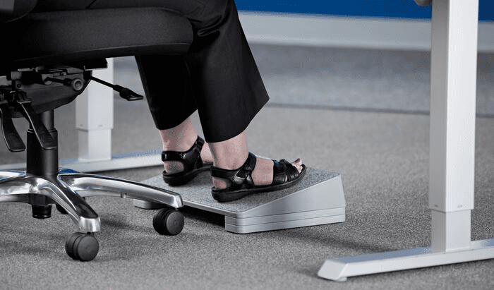 Kalau korang perlu tinggikan kerusi untuk memastikan kedudukan tangan jadi selesa semasa buat kerja, periksa pula kedudukan kaki. Kaki korang sepatutnya terletak elok di atas lantai. Kalau kaki korang tergantung di udara sebab kerusi tinggi sangat, ia akan menjadi beban kepada pinggang sebab graviti akan menarik kaki ke bawah dan ini akan menambah beban pada pinggang. Kalau kaki tak cecah lantai, sebaiknya letakkan bangku kecil supaya korang boleh letakkan kaki di situ. Kalau takda bangku ke kat rumah tu kotak kasut yang tak pakai pun boleh je guna.