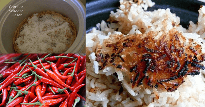 - Masukkan ke dalam periuk yang terisi nasi hangit dan biarkan seketika. Cili kering tu akan serap semua bau hangit tu.