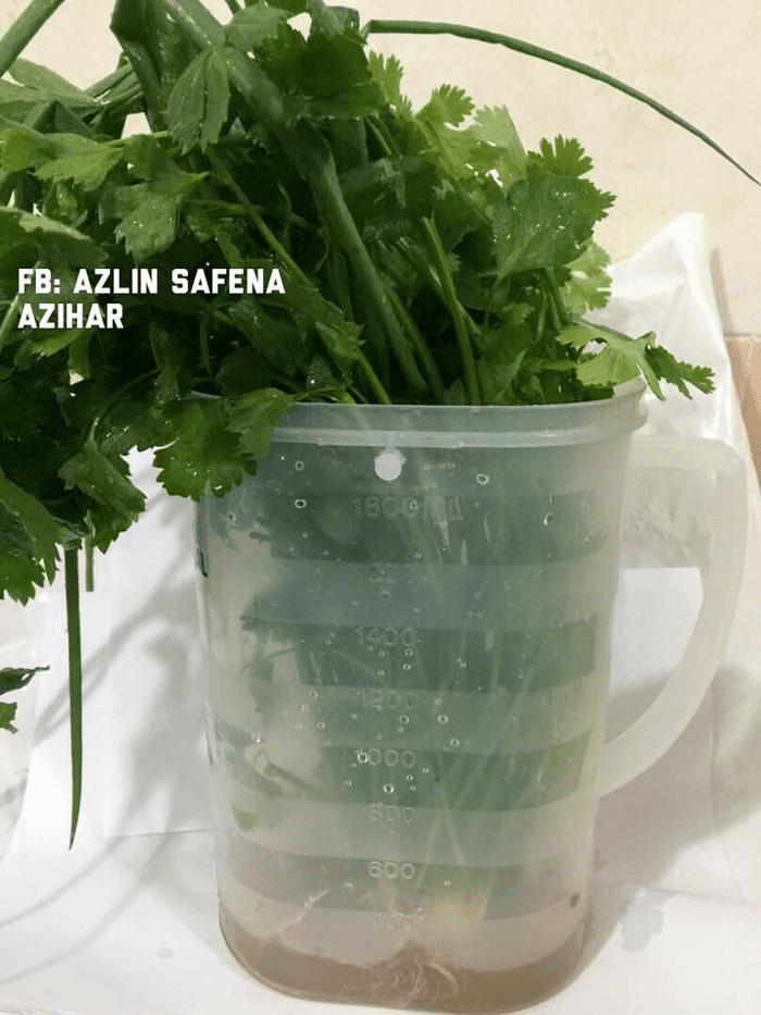 - Masukkan daun sup ke dalamnya dan pastikan hujung akar sahaja yang kena air. Ini kerana kalau batangnya yang terkena air, daun sup akan cepat lembik dan rosak.