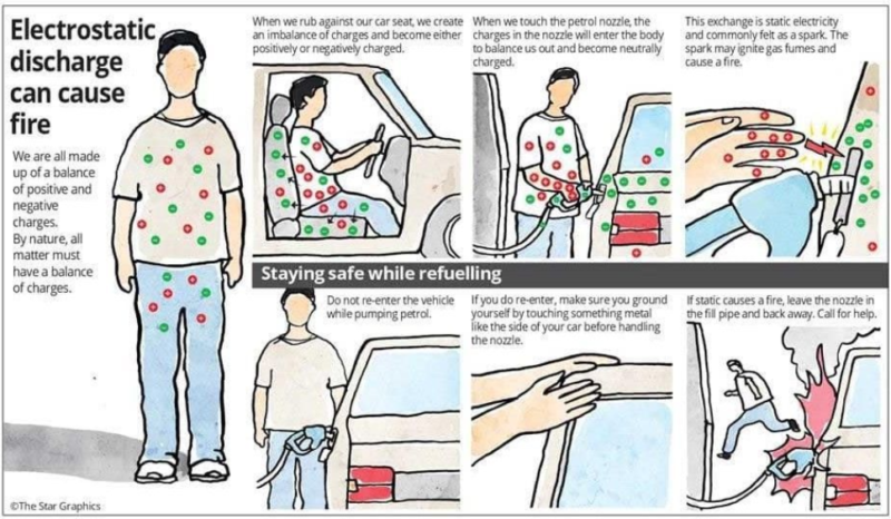Badan kita secara semulajadi mempunyai caj elektrik, dan mampu menghasilkan cas elektrostatik lebih-lebih lagi setelah badan kita bergesel dengan kerusi kereta ketika memandu. Sebelum mengisi minyak kereta, sangat dinasihatkan untuk menyentuh logam pada kenderaan korang bagi menyahcaskan eletrostatik pada diri korang. Cas elektrostatik ini mampu menghasilkan percikan pada wap petrol ketika mengisi petrol dalam kenderaan dan menyebabkan kebakaran.