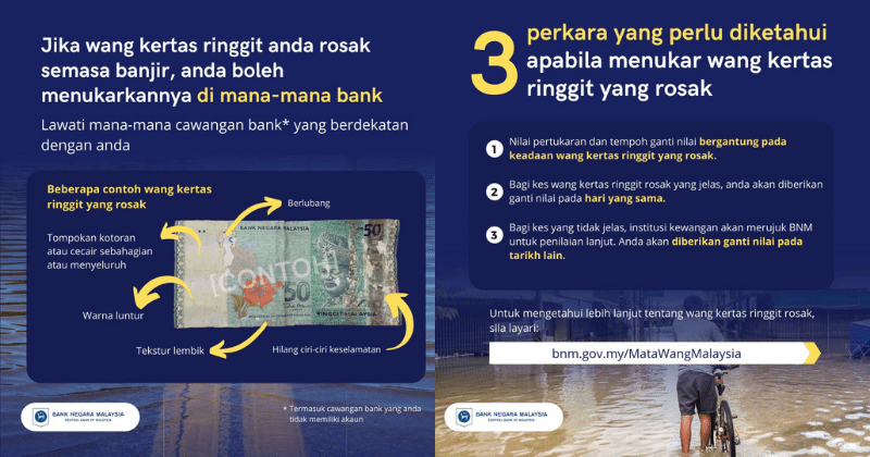 Kalau korang ada duit yang mempunyai jenis kerosakan seperti yang dekat atas ni, jangan buang dulu! Korang boleh bawa ke bank yang berdekatan untuk tukar duit rosak kepada duit yang baru. Ya, tak perlu pergi ke BNM pun untuk tukar duit rosak. Datang je ke mana-mana cawangan bank yang berdekatan. Cuma kalau jenis kerosakan yang terlalu teruk sampai perlukan siasatan, lebih baik bawa duit tersebut ke BNM.