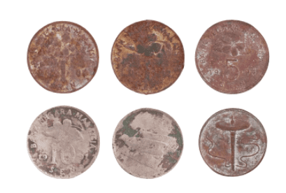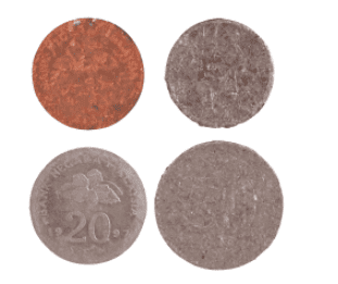 - Terhakis:Sebahagian atau keseluruhan duit syiling yang terhakis secara kekal akibat tindak balas kimia.