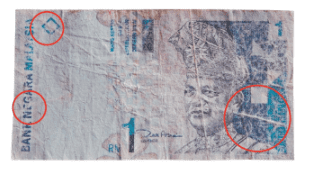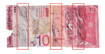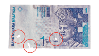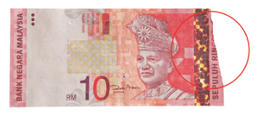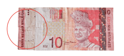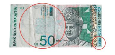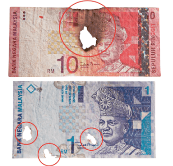 - Hilang Ciri Keselamatan: Salah satu ciri keselamatan duit kertas hilang ataupun rosak.