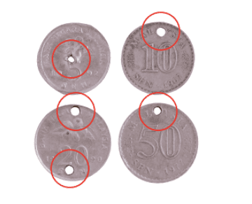- Berlubang: Syiling yang mempunyai lubang yang ketara pada mana-mana permukaannya.