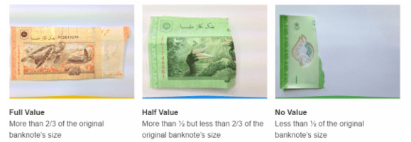 - Nilai Penuh: Nilai penuh akan diberikan kepada duit kertas cacat yang masih mempunyai ⅔ atau lebih daripada saiz duit kertas yang asal.
