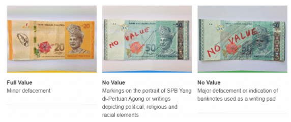 - Tiada Nilai: Duit kertas yang dirosakkan dengan cara yang nyata seperti menconteng potret YDPA dengan karikatur yang berbaur politik, ataupun duit yang dijadikan kad jemputan atau kertas menulis.