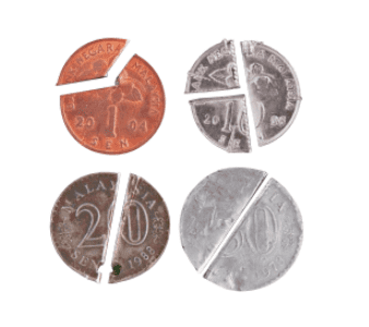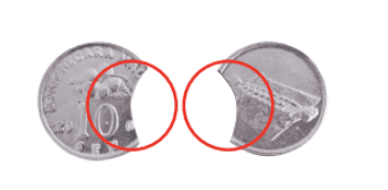 - Terpotong: Duit syiling yang terpotong oleh objek tajam.