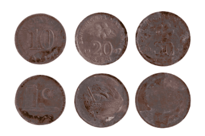 - Terbakar: Duit syiling yang terbakar hingga mengubah rupa duit menjadi kusam.