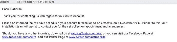 Nota: Dalam Terma & Syarat Astro, pelanggan perlu berikan minimum 1 bulan sebelum notis untuk tutup akaun. Lebih tepat lagi sebelum bil bulan seterusnya dikeluarkan.